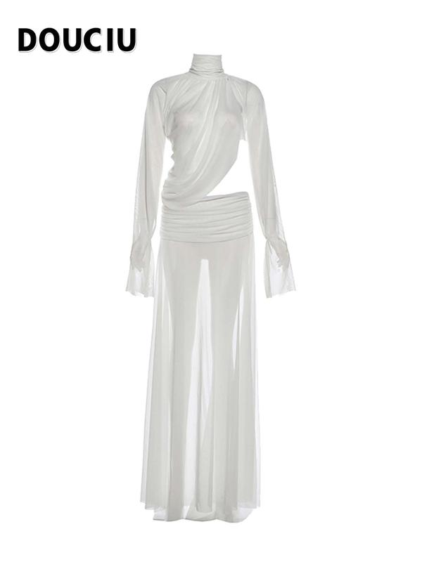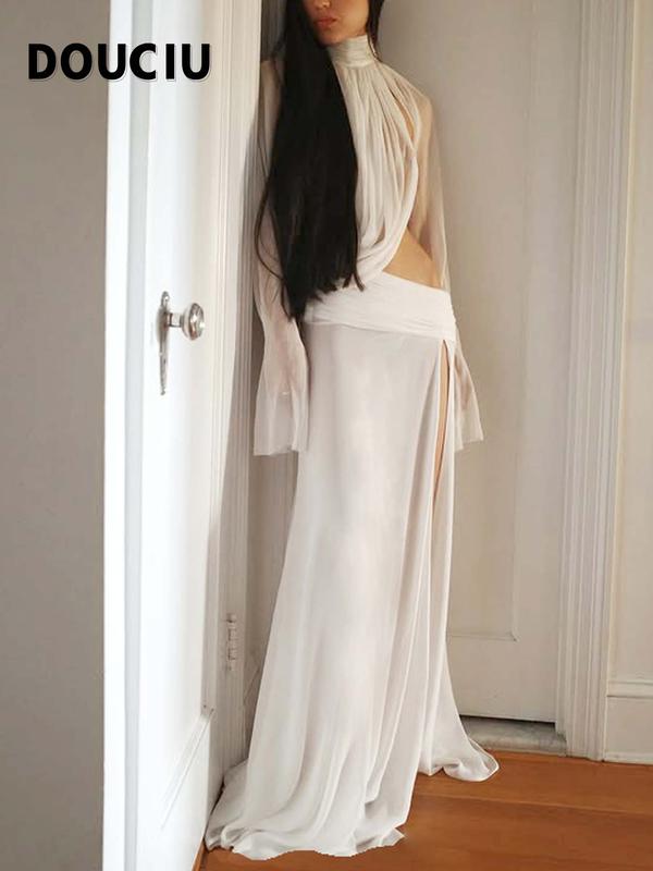 DOUCIU Summer Beach Vacation Yacht Party Sexy Hot Beautiful Cool Women'S Thin Style Solid Color Mesh See Through Long Sleeved Top Skirt Two-Piece Set