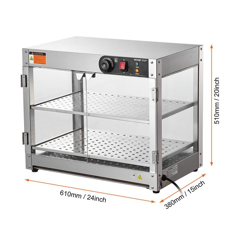 • 2-Tier Large Space: Dimensions: 24 x 14.96 x 20.08 inch / 610 x 380 x 510 mm. Our countertop food warmer display features two spacious food-grade shelves, allowing you to freely place foods of different sizes. Ideal for storing and displaying pizzas, egg tarts, fried chicken, or hamburgers, ensuring long-lasting freshness.