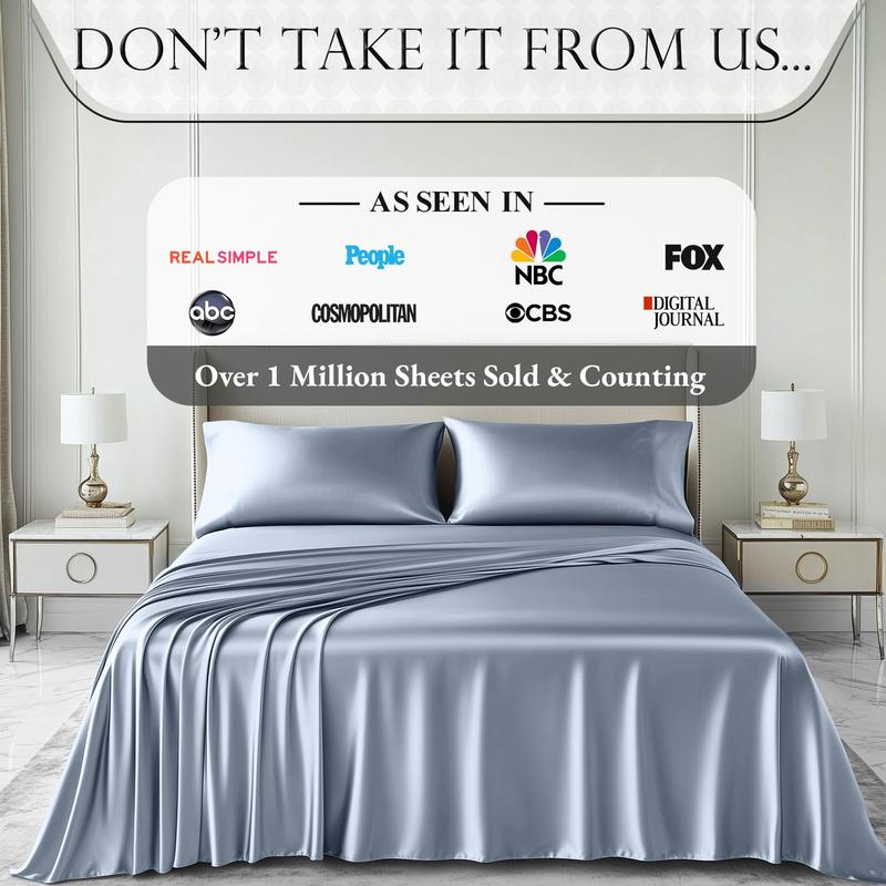 Suitable for all bed & mattress sizes, our cooling satin silky sheets bed set includes a flat silk sheet, fitted sheet with a deep elastic pocket, and matching silky pillowcases.
