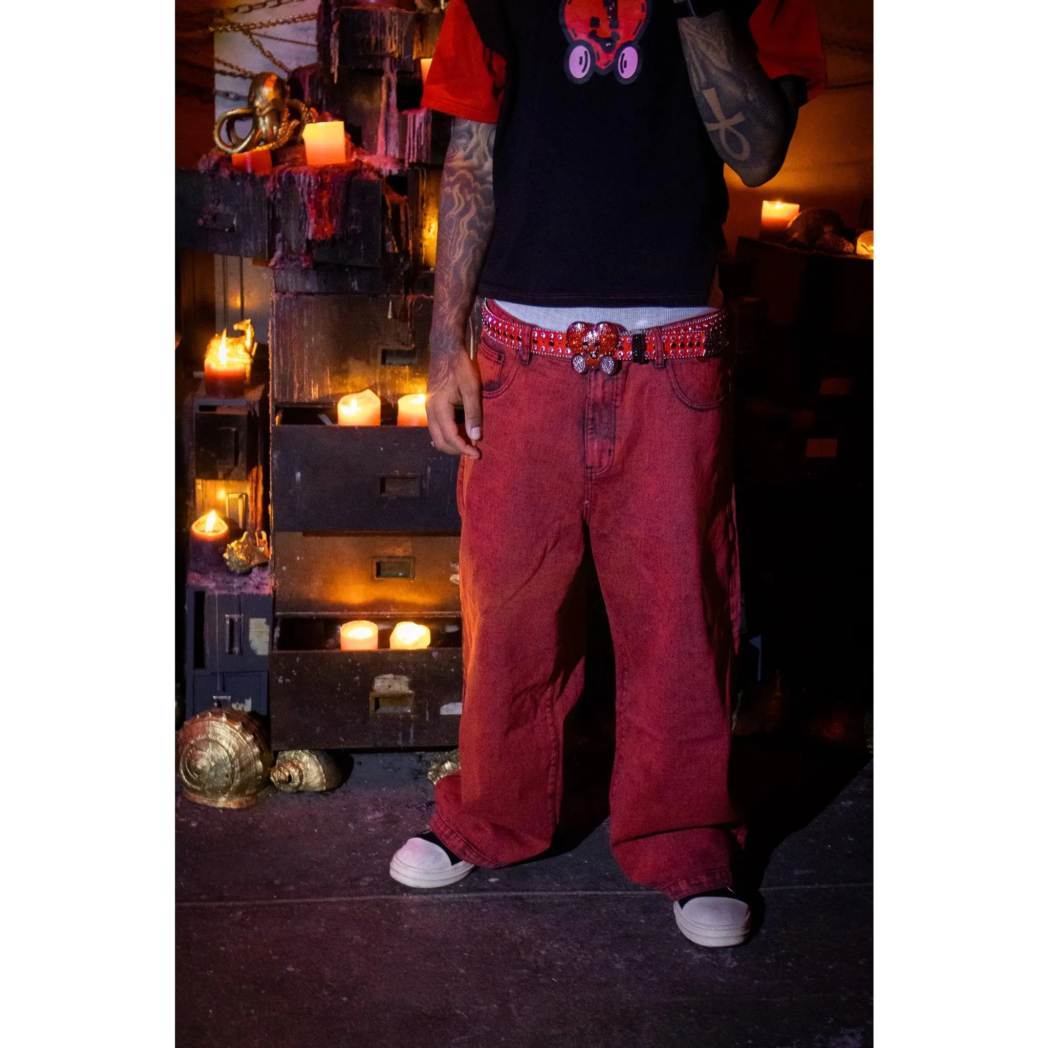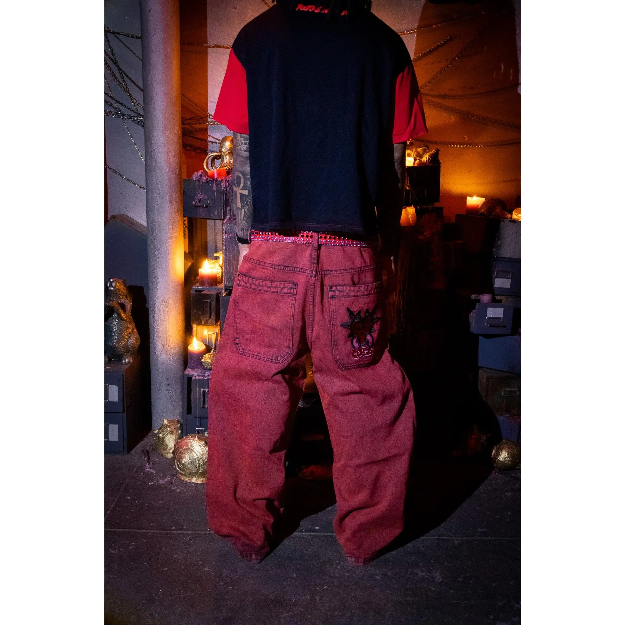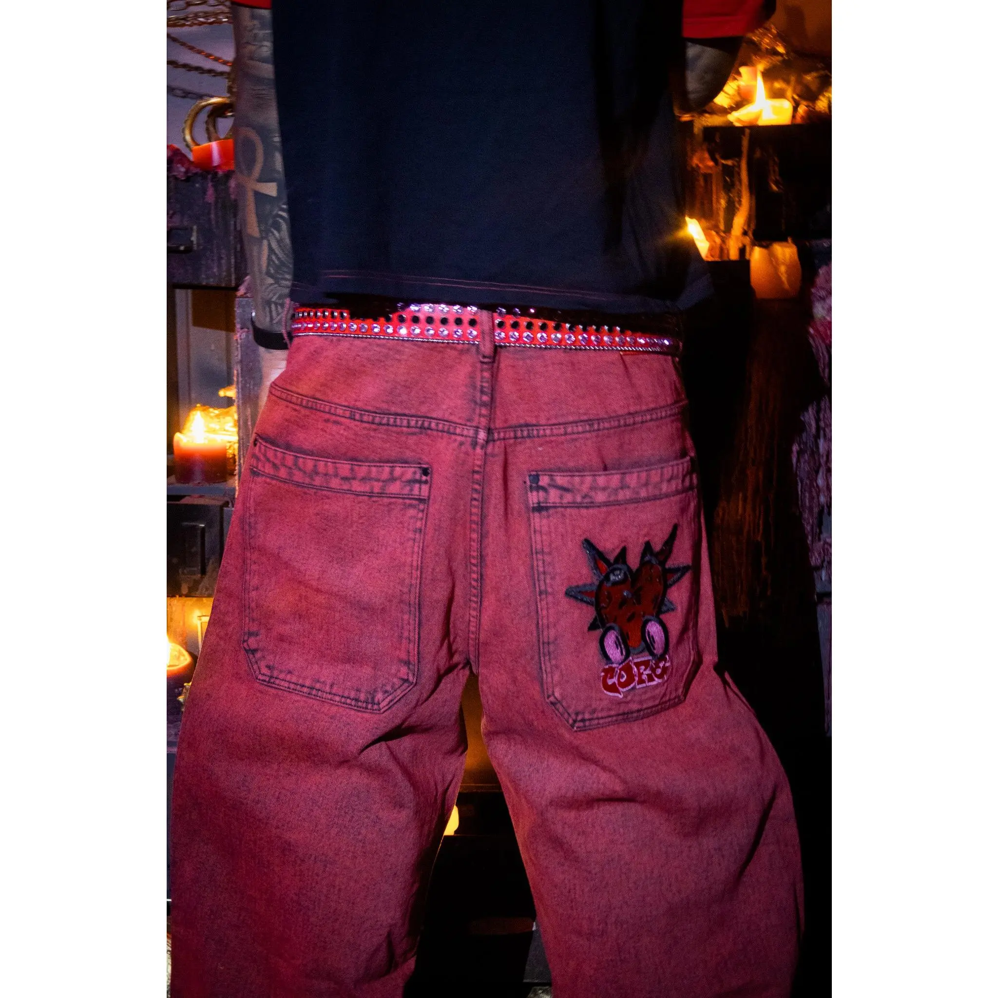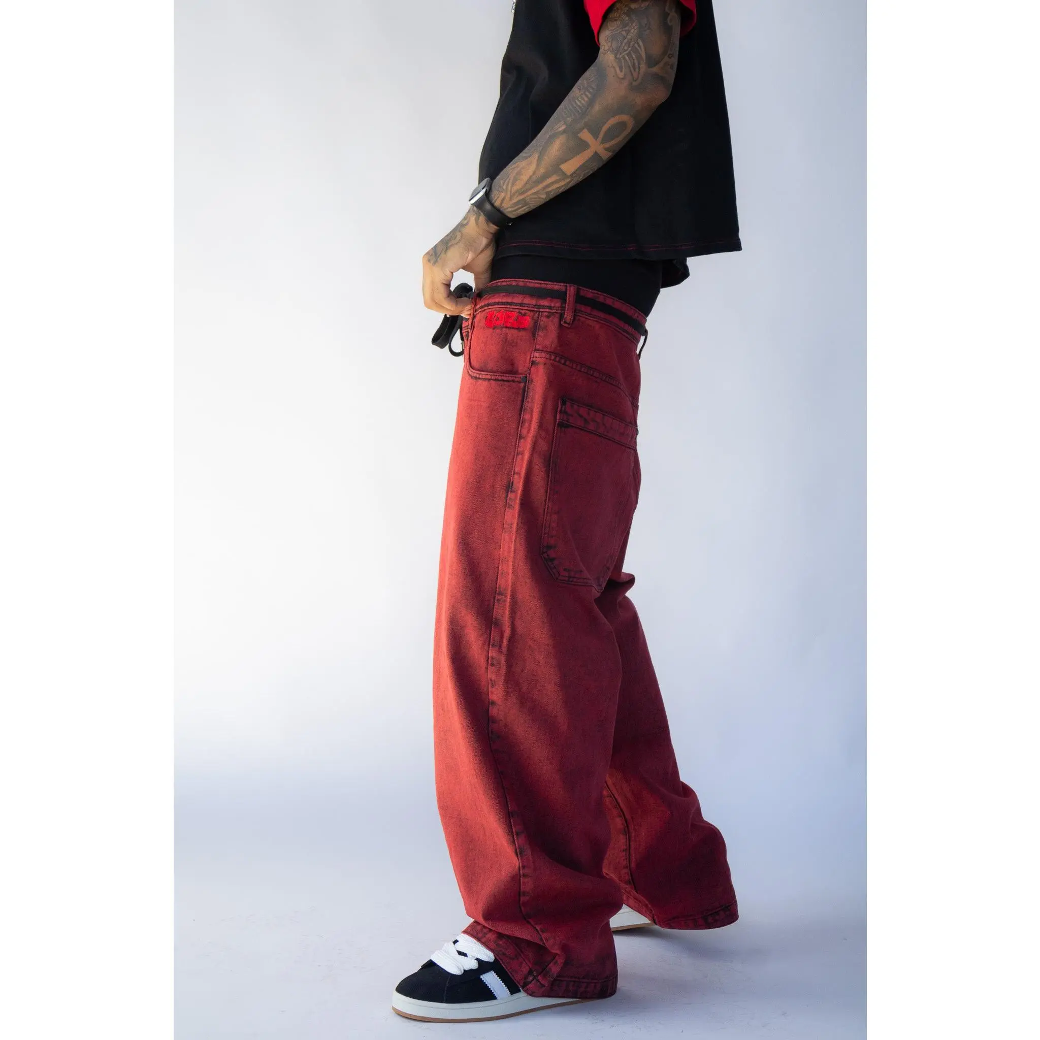 Details: Custom red stitching, large back pockets, Double hem on the bottom & on back of pockets