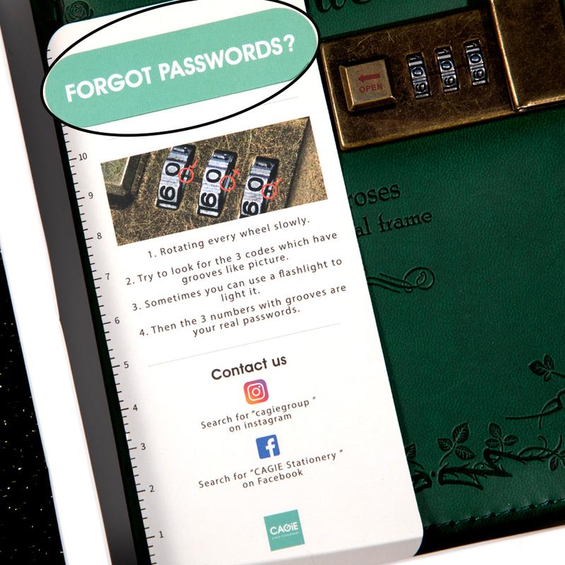 ·PERSONAL LOCKING JOURNAL -- CAGIE diary with lock is simple to operate.0-9 3-digit password code,1000 of number combination, a good degree of confidentiality. Don't worry about others seeing your secrets