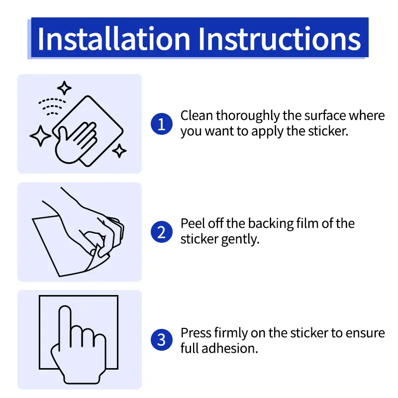 Comes with pre-applied high-performance adhesive. Installation is straightforward: clean the surface, peel off the backing, align, press firmly, and you’re done. No tools are needed, and it can be removed without residue.