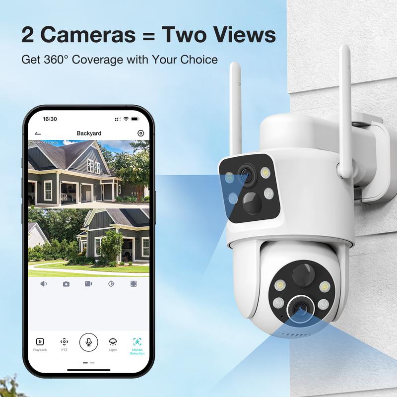 Dual Lens Solar Security Cameras Wireless Outdoor, 2K Full HD Video, 360° View Pan/Tilt Home Security Camera with Color Night Vision, Easy to Install, PIR Alarm, 2.4GHz WiFi