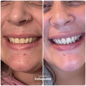 Horrible horrible review I put this on and left white stain on my teeth now I don’t know what to do. This is beyond repair believe the reviews not the collaborators.