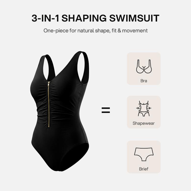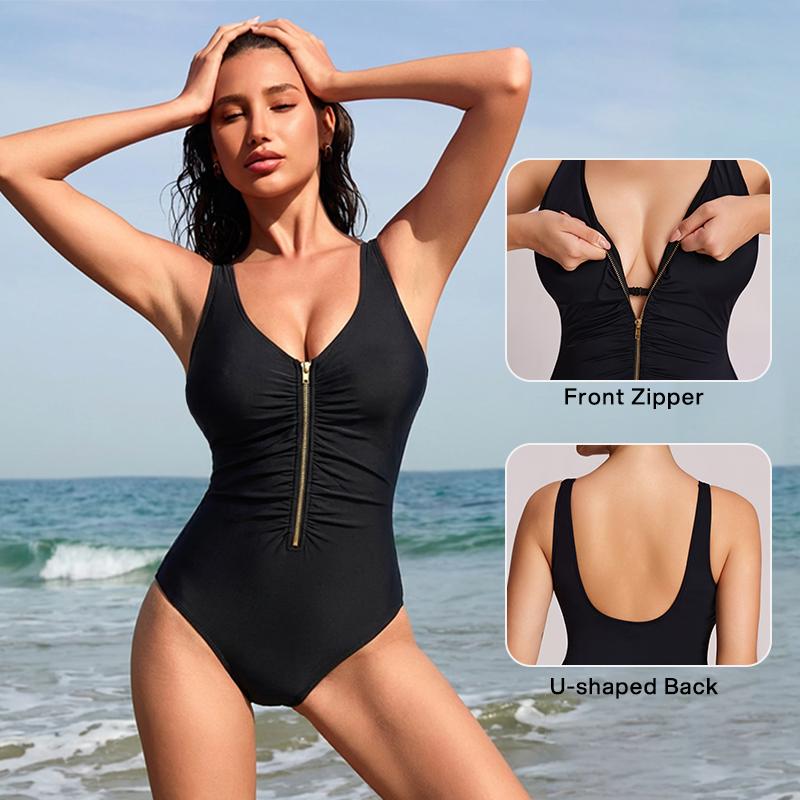 PREMIUM ZIP FRONT SCULPTING SWIMSUIT Experience ultimate freedom in our ultra-soft skin-friendly fabric made of 80% Nylon and 20% Elastane which is 30% lighter and 40% more elastic than standard swimwear for a true second-skin feel. This innovation features a front zipper with an internal buckle ensuring effortless dressing even when the fabric is wet. The built-in power-mesh lining flattens the tummy to define an S-curve while the high-coverage hip design with wide leg openings perfectly wraps your seat and lifts the booty line. The elegant ruched detailing visually slims the midsection while wide shoulder straps significantly reduce pressure for all-day comfort. A sophisticated V-neckline elongates the neck and shoulder proportions complemented by removable padded bras for customizable support. Available in an inclusive range of sizes it is the ideal choice for beach vacations or pool parties where functional shapewear meets modern convenience.