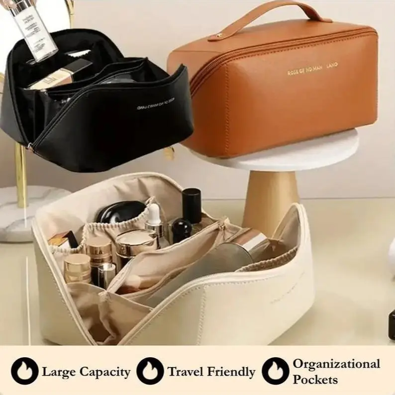 Expandable PU Makeup Bag - Roomy Travel Cosmetic Organizer with Handle | Vanity & Trip Essential