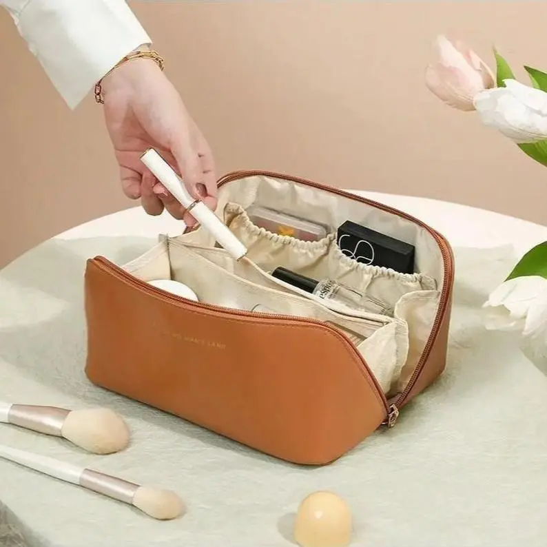 ·Expandable Open-Top Design (No More Digging!): Unlike regular zipped pouches, this bag opens wide to lay flat or stand upright — you can see every lipstick, makeup palette, brush, or serum at a glance. Getting ready is faster and less frustrating, whether you’re doing a morning routine, travel touch-ups, or midday fixes.