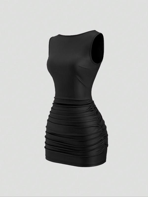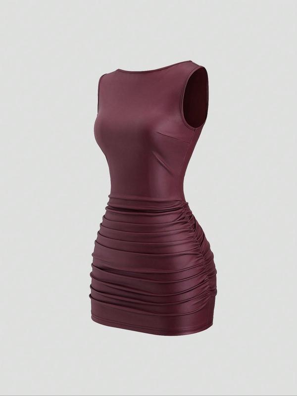 Women's solid color slim-fit sleeveless pleated faux leather dress, pleated design#tiktokshop #spolightfinds #elegantdresses #ootd #casualoutfits