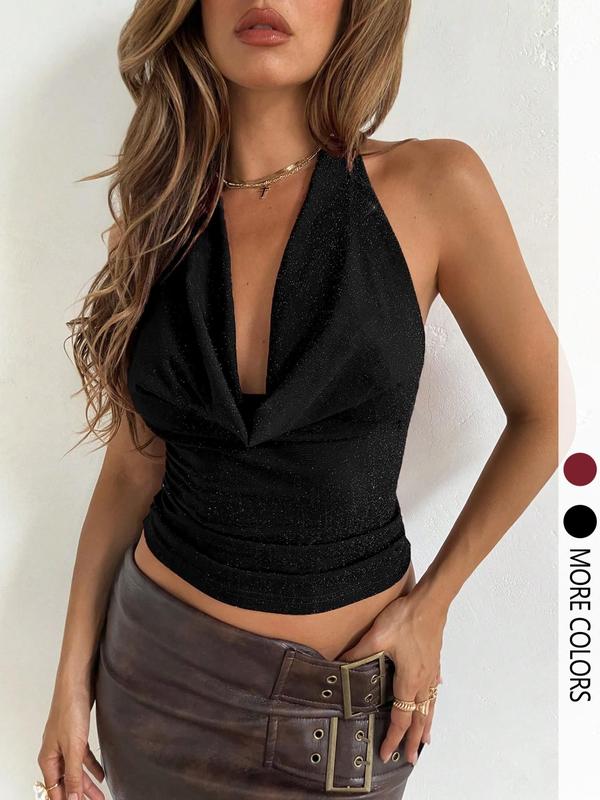 Women's sequined solid color backless camisole top, casual sleeveless top for summer, suitable for everyday women's wear.