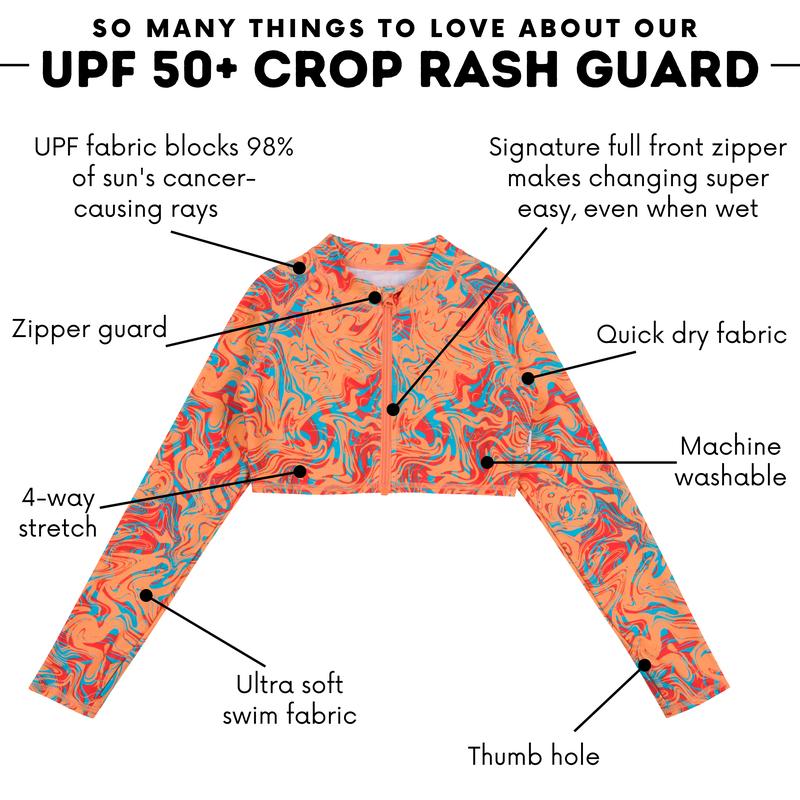 Our girls Crop Rash Guard is perfect for a day out at the beach, pool, or just going for a stroll. This long sleeve cropped swim jacket is the cutest, easiest way to provide extra sun protection, both in and out of the water.