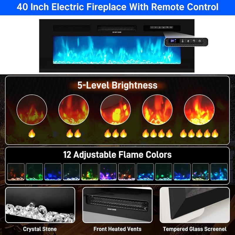 5. 40" Recessed and Wall Mounted Electric Fireplace, Low Noise, Remote Control, Electric Fireplaces Insert, 12-Color Flame, Brightness & Speed