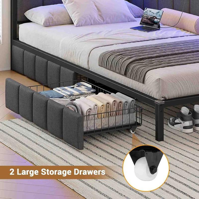 Two spacious drawers fitted beneath the bed frame feature four smooth-rolling wheels each, enabling easy access for storing bedding, clothing, toys, and more. Each drawer is equipped with a secure locking buckle to prevent accidental opening, keeping items neatly contained and the room tidy.