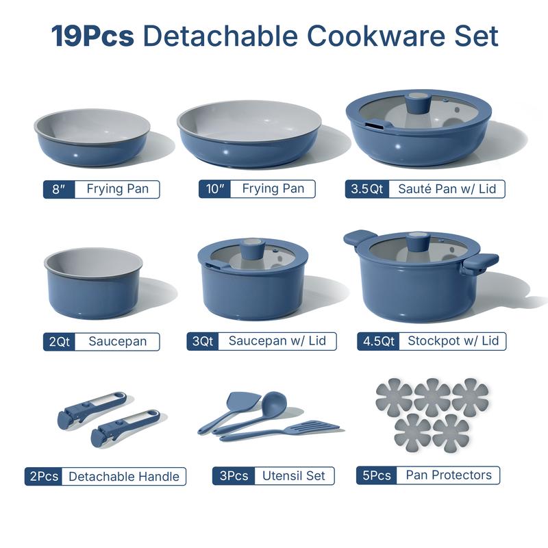 This 19Pcs set Includes: 8'' frying pan, 10'' frying pan, 3.5-qt saute pan with lid, 2-qt saucepan, 3-qt saucepan with lid, 4.5-qt casserole with lid, 2*detachable handle, 3pcs utensil set and 5pcs pan protectors.