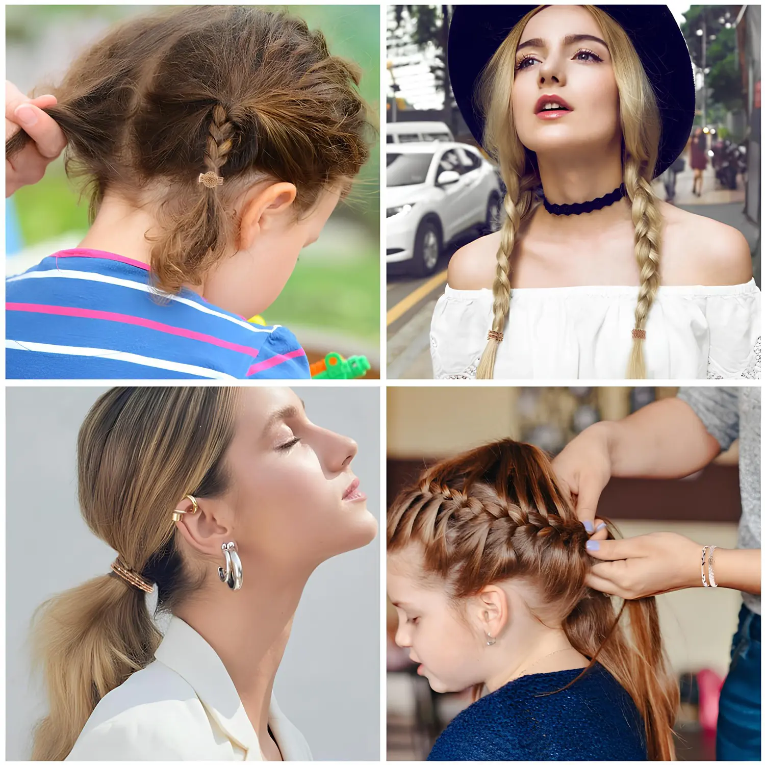 10 Boho Bracelets, Braided & Stretch Hair Ties for Thick/Thin Hair, 5 Styles, Light Coffee Colors - No Damage Ponytail Holders
