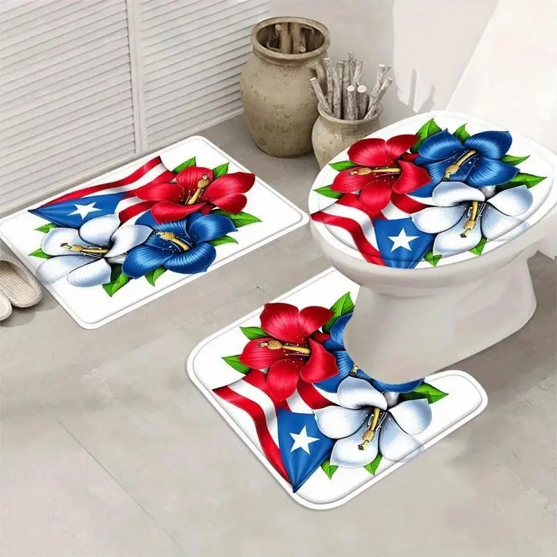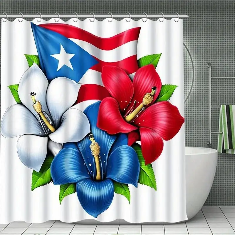 1/4pcs Puerto Rican flag pattern shower curtain set, includes non-slip mat, U-shaped rug, and toilet seat cover. Perfect for bathroom decoration, partitioning, and beautifying the space. Comes with 12 shower curtain hooks. Bathroom Decoration Accessories