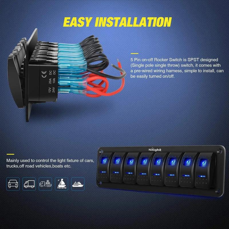 Rocker switch panel with pre-wired wiring harness for you to easily install in both 12V and 24V vehicles, yachts, ships, caravans, trucks, etc.