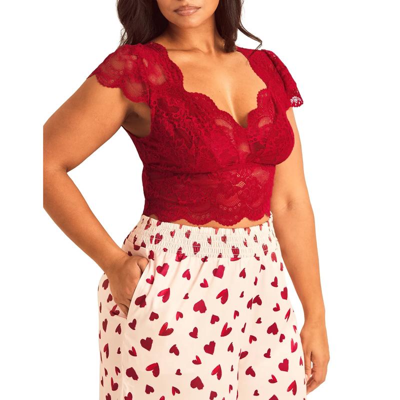 This luxurious plus-size lounge set crafted from satin and lace. The set features a lace short-sleeve crop top with lined cups and wide-leg satin pants with pockets, perfect for relaxing in style.