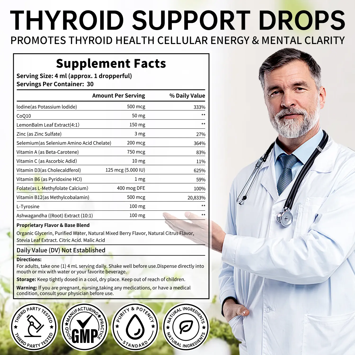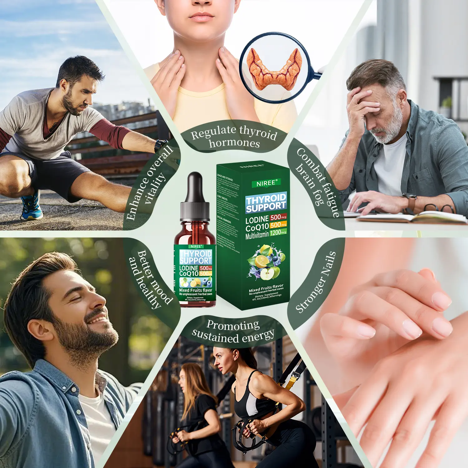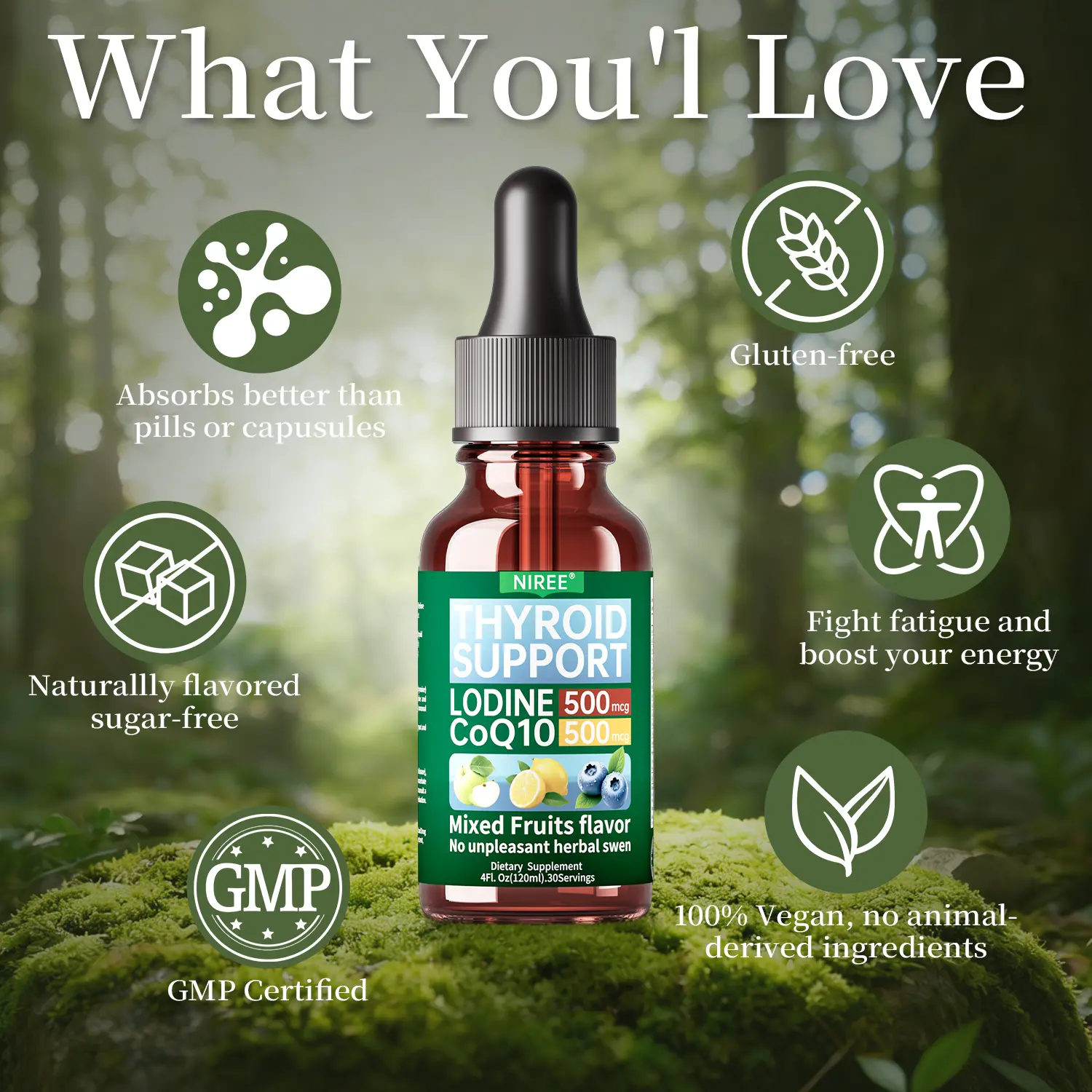 NIREE Thyroid Support Liquid Drops with Iodine 500mcg and CoQ10 500mg, Mixed Fruits Flavor, 4 Fl Oz, 30 Servings