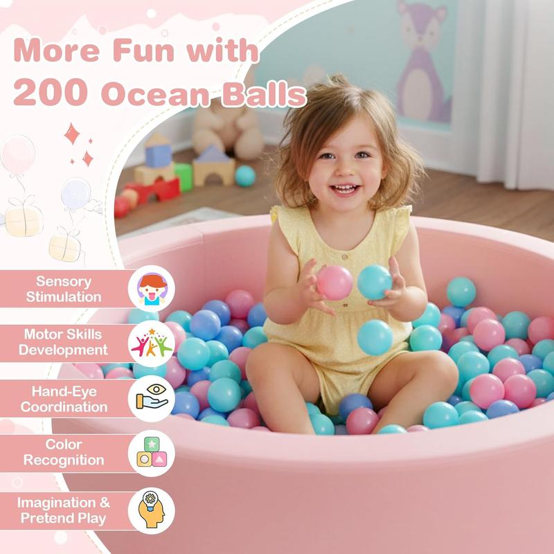 ·Private Play Space with 200 Ocean Balls: Transform kid’s playtime into an exciting adventure with a ball pit that comes with 200 ocean balls. This spacious design offers ample room for toddlers to laugh and play together, while the ocean balls provide endless opportunities for sensory learning, promoting tactile development.