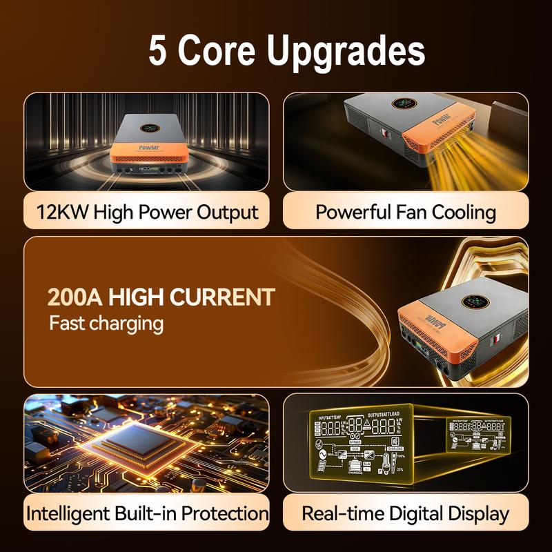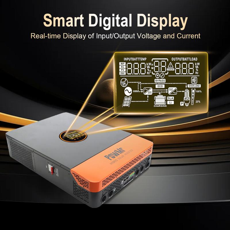 ·【CHARGING MODES AND TIME CAN BE SET】Pure Sine Wave Solar Inverter has 4 optional charging modes, solar only, mains priority, solar priority, and mixed mains/PV charging; and with two output modes of utility bypass and inverter output, with uninterrupted power supply function.【FULL PROTECTION AND APPLICATIONS】PowMr's 12KW Solar Inverter with complete short circuit protection, over-current protection, over-under voltage protection, overload protection, backfill protection, etc, is ideal for off-grid backup and self-use applications. Widely used for home, cabin, camper, RV, trailer, boat, and so on and used as backup supply while utility outages.