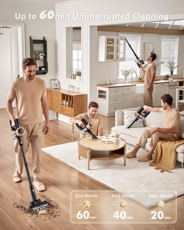 Powered by a high-capacity 4000mAh battery, this cordless vacuum offers up to 60 minutes in Eco mode, 40 minutes in Mid mode, and 20 minutes in Max mode. Compared with standard batteries, it provides longer runtime, fewer recharges and more consistent suction throughout your clean.