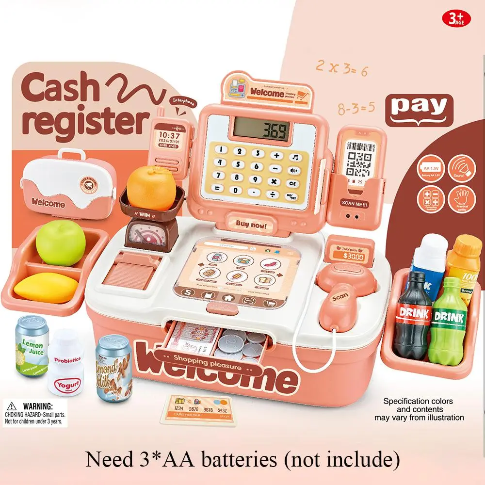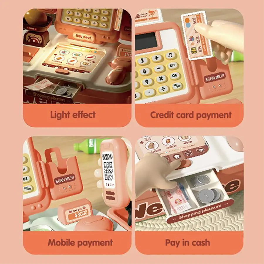 Simulation Cash Register Toy, Supermarket Cash Register Toy with Scanner & Coin & Bank Card & Food, Pretend Play Toy for Kids