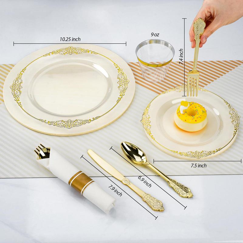 • 🍽️ Our clear gold trim plastic plates are ideal for 50 guests. The set includes 50 dinner plates, 50 dessert plates, 50 knives, 50 forks, 50 spoons, 50 pre-rolled napkins, and 50 cups. Everything you need for a large gathering is in one box.