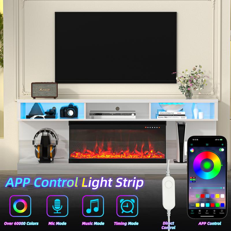 ·Smart APP controlled light strip: This modern TV cabinet electric fireplace is equipped with an upgraded smart light strip. The LED light strip can control the RGB light through the mobile phone APP, with more than 3 sound-changing light modes, which can customize the space and atmosphere. No need to worry about finding the remote control anymore!