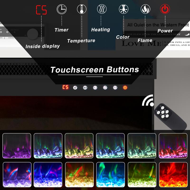 ·MULTIFUNCTIONAL ELECTRIC FIREPLACE: Fireplace insert heats independently with overheat safety protection, adjustable temperature, 12 realistic flame colors, time settings and a 5-level dimmer, and the above functions can be controlled by remote control or buttons. Two outputs of 750 and 1500 watts keep you warm and save energy, and heat up to 300 square feet for a cozy and relaxing environment.