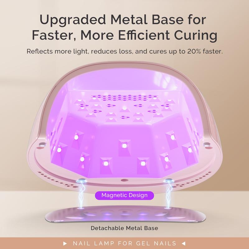 ·Upgraded Magnetic Metal Base for Faster, More Efficient Curing: The upgraded magnetic, reflective metal base enhances light reflection, reduces curing dead zones, and maximizes light utilization—delivering significantly faster and more efficient curing than standard ABS bases. Its detachable design allows easy use for both manicures and pedicures.