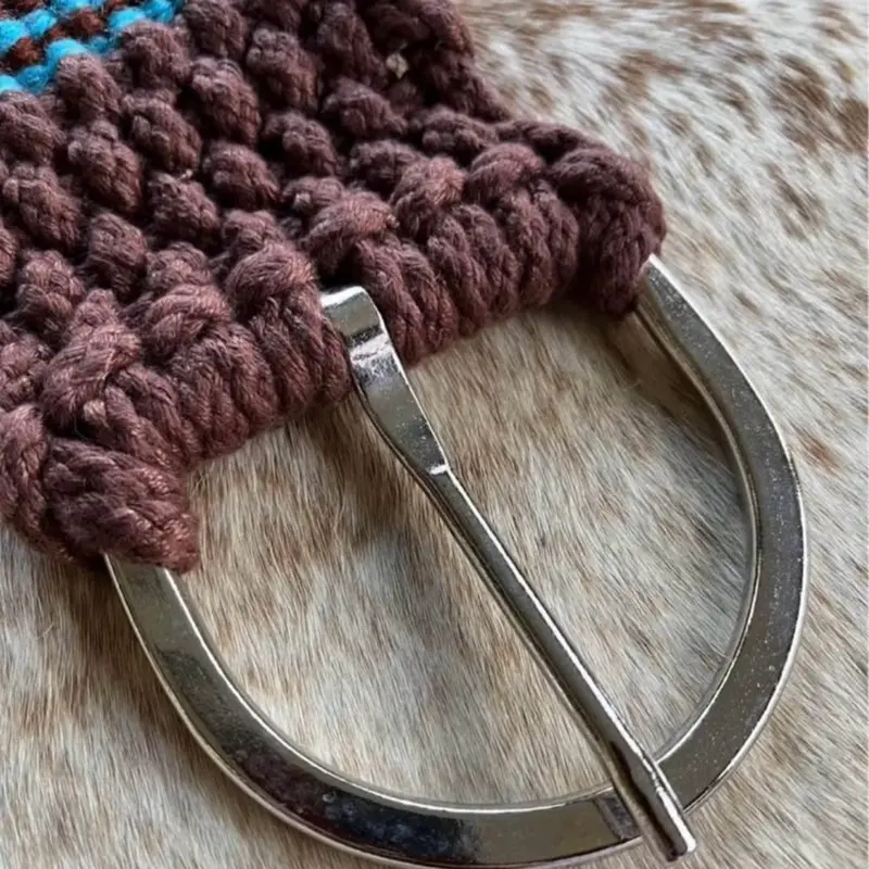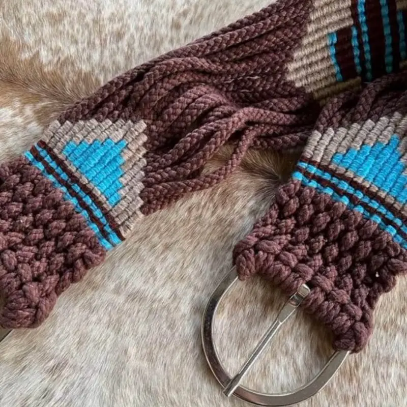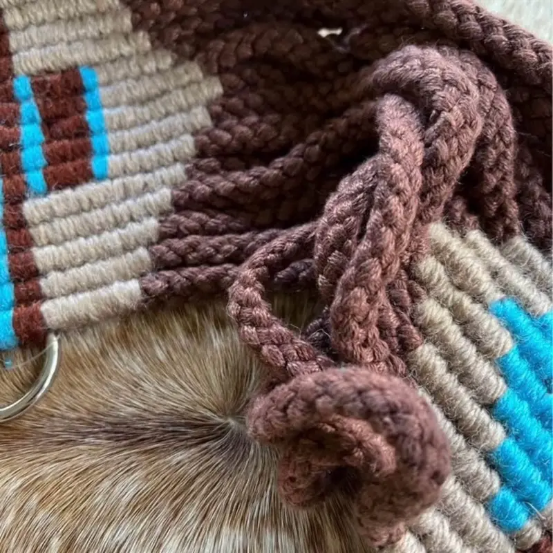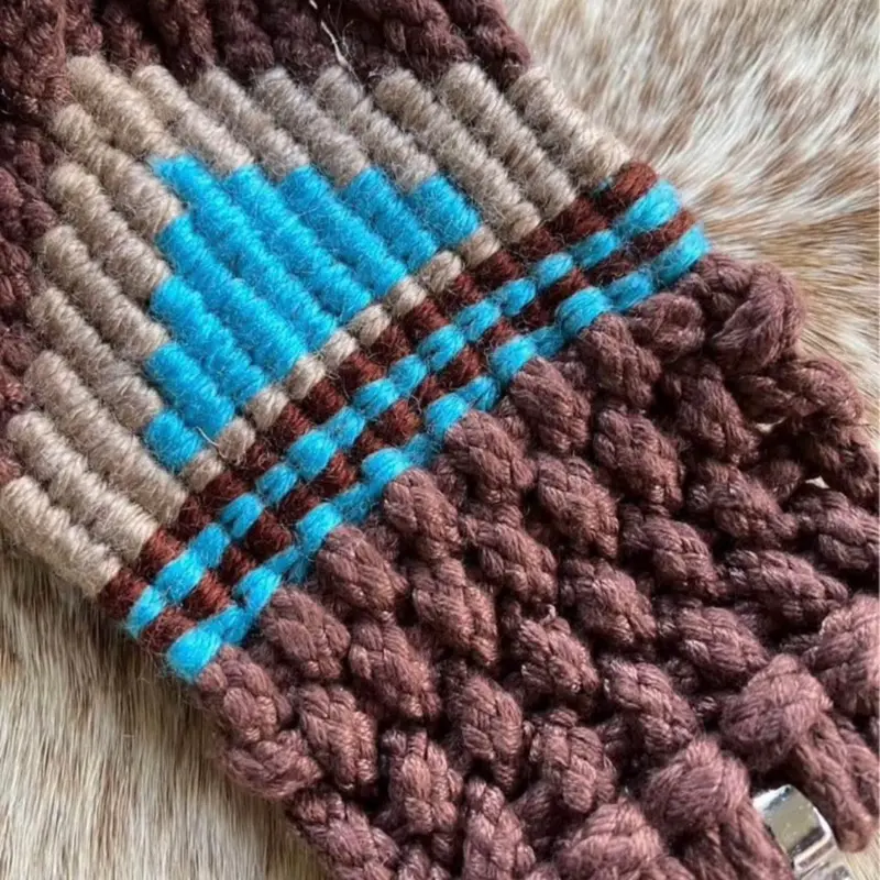 This nice 100% WOOL western saddle girth is a 30” size. Brown color with teal and tan Aztec design. Dee rings in the center for noseband and/or flank cinch attachment. Stainless steel flat buckles. The brown strands are woven on both sides to help support the strands of the girth. Functional as well as super sharp design! The wool will help wick moisture away.