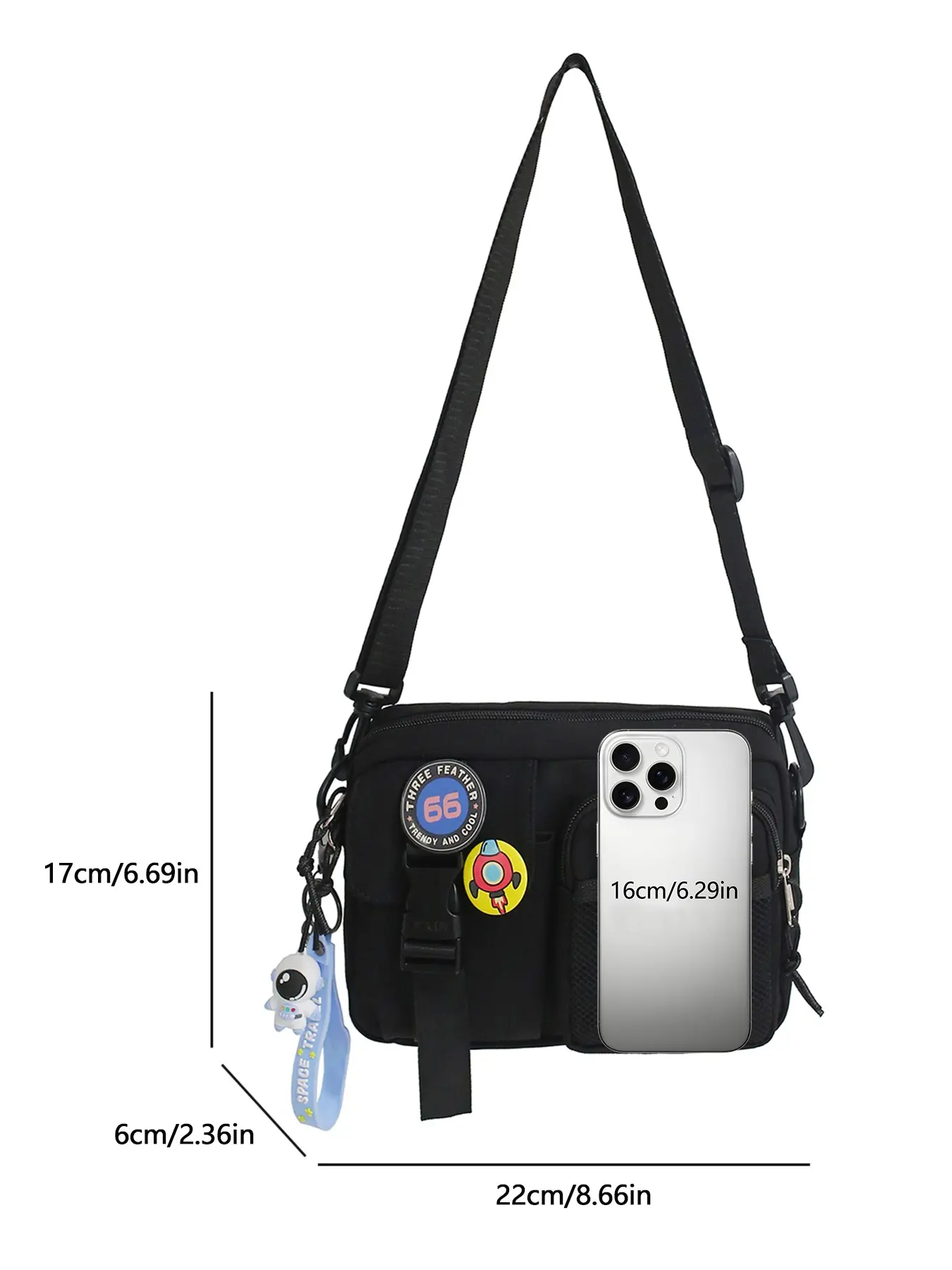 Black fashionable casual simple shoulder bag, practical and atmospheric texture crossbody bag, with badge and alien pendant pendant design, can accommodate mobile phones and keys, suitable for walking and shopping