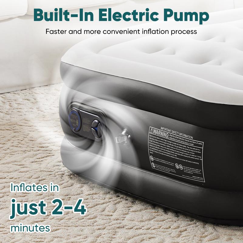 ·The air bed can be inflated/deflated in minutes with the built-in 110V high power electric air pump. Inflation times vary by size: 22in queen - 240s; 18in queen - 200s; 16in queen - 150s; 18in twin - 130s; 16in twin - 110s.