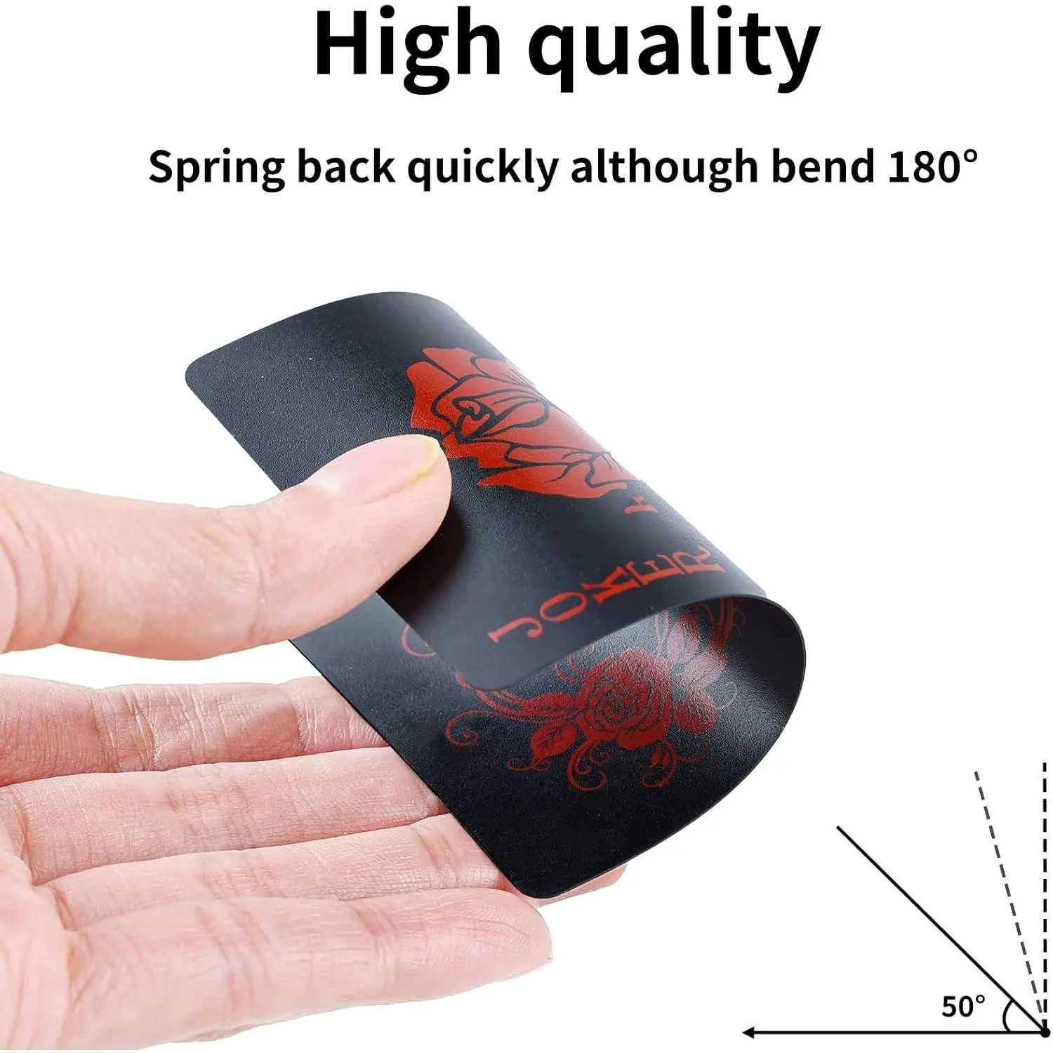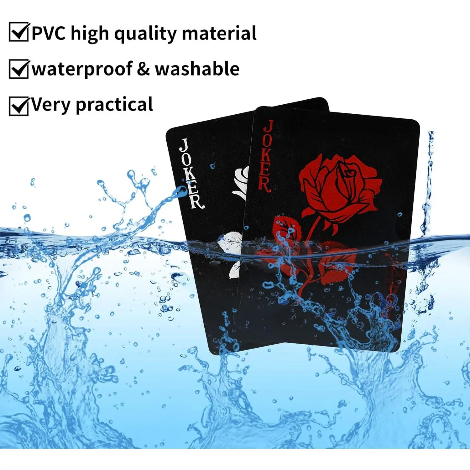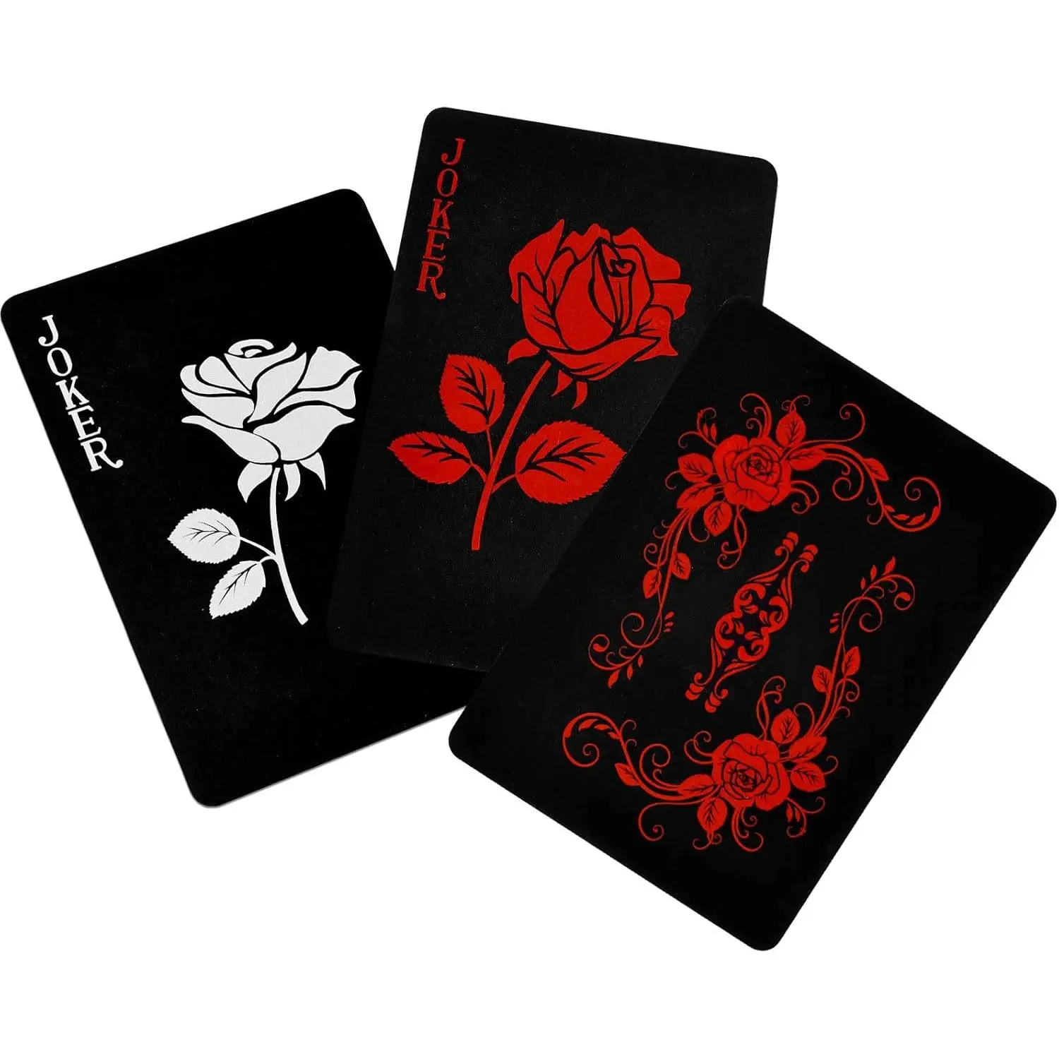 Textured Black Playing Cards - Poker cards adopting delicate pattern and flower backing design, more beautiful, select PVC material, more durable. Easy to Read - Deck of cards designed with black background, white and red pattern, can read them although playing them at night. 100% Waterproof & Washable - Waterproof performance means can feel free to wash them under water, no worry for sprinkle with milk and drinking. Easy to Use & Shuffle - Excellent flexibility means can easy to fan out on hand, and easier to shuffle than normal poker, although bent to 180°, also can spring back immediately. Size & Package - With the size of 2.5 x 3.5 inch, perfect for left and right hand use. Including 52 playing cards and 2 Joker cards, a completed poker playing cards.