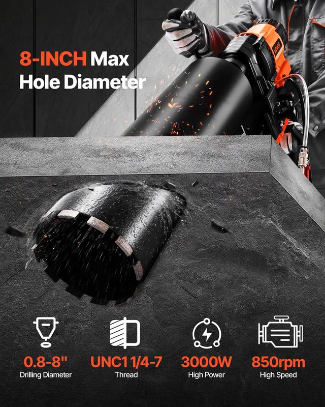 ·Powerful & Fast Drilling: This core drill is equipped with a robust 3000W motor and spins at 800 RPM, delivering fast, efficient drilling. It handles holes up to 8 in (200 mm) with a 1/4-7 in threaded output shaft—ideal for heavy-duty tasks