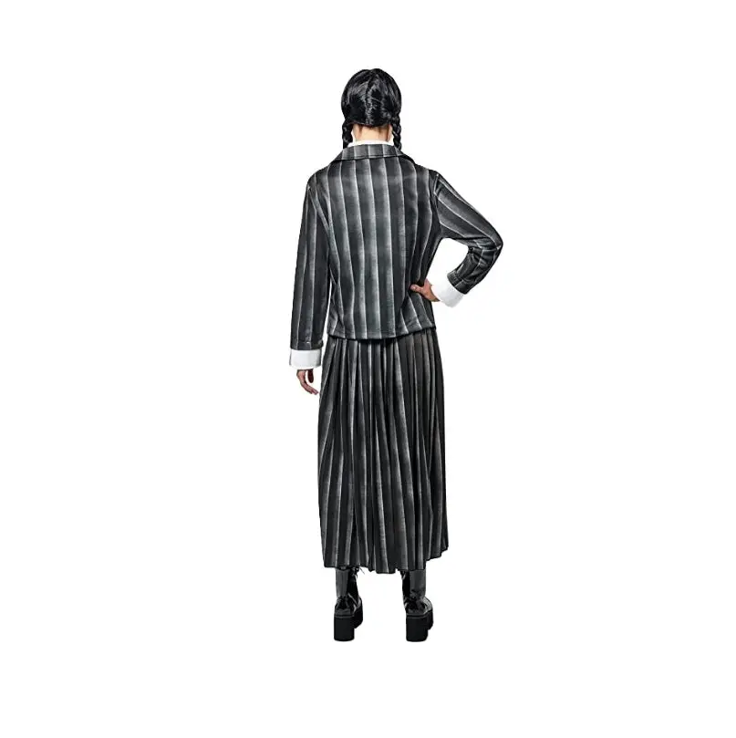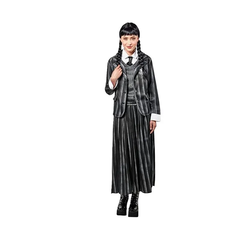 Wednesday is allergic to color. This officially licensed black and gray Wednesday Nevermore Student Academy Uniform from the live action series, Wednesday, directed by Tim Burton includes a black top with attached collar and partial tie, jacket with Nevermore Academy logo and matching skirt. Once you have it on, you'll look just like Wednesday - all mysterious and spooky! This costume dress is available in 3 women's sizes Small 4-6, Medium 8-10 or Large 12-14. Costume sizes tend to fit a little smaller than clothing sizes - please purchase accordingly. Other Wednesday costumes and accessories (wigs, leg wear, Thing shoulder sitter prop, theatrical makeup...) are sold separately on our page - subject to availability. Footwear and stockings not included.