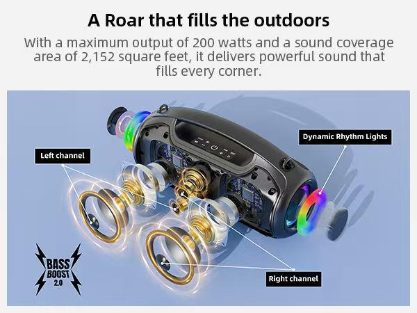 Dive into powerful sound with the Vocan Portable Bluetooth Speakers. Packed with 200W peak sound, these speakers deliver deep bass for an immersive audio experience. Equipped with 2 subwoofers and tweeter DSP, they enhance your music with precision. The IP65 waterproof design ensures durability for outdoor use. Enjoy 24H playtime with fast charging and TWS functionality. Connect via TF, USB, AUX for versatile audio options.