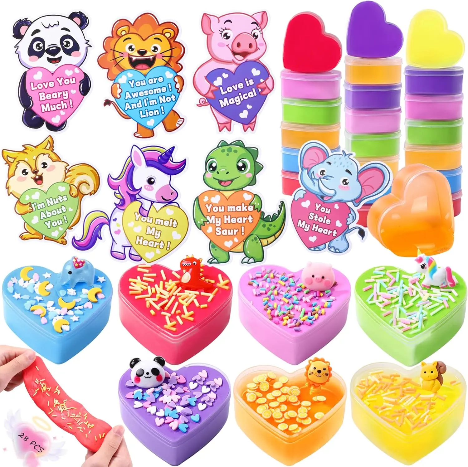 ·Package Includes: Our Valentine's Day slime set comes with 28 cute animal cards and 28 jars of heart-shaped slime in 7 different colors, including butter slime and crystal slime. Plus, you get 28 sets of decorative accessories in 7 style to mix and match however you like to make your kid's Valentine gift-giving super special