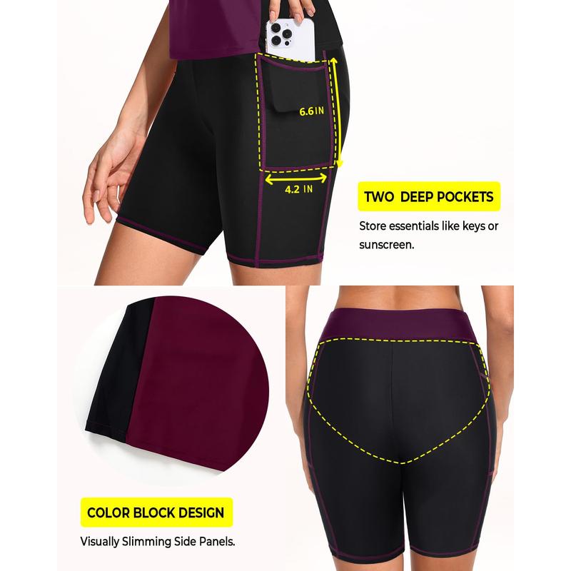 ·Athletic High-Waisted Shorts: Engineered for active performance, our 7-inch swim shorts combine a tummy-smoothing high waist with stretchy athletic fabric. Two deep pockets securely store essentials like keys or sunscreen.