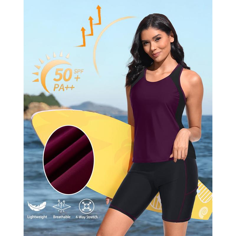 ·Versatile Three-Piece Swimsuits: This vibrant color-block tankini set includes a tankini top, a bikini sport bra with removable pads, and 7-inch high-waisted shorts featuring side pockets. Mix and match pieces for beach days, pool parties, or active water sports.
