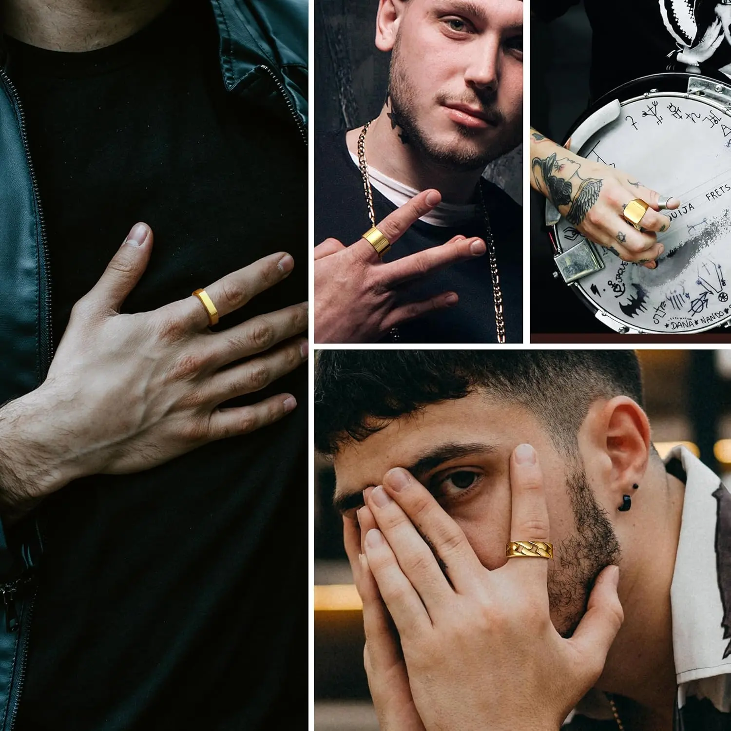 This set includes 5 distinct 14k gold-plated rings: Square Signet, Glossy, Wide Band Link Chain, Wedding Band, and Thick Pinky. Perfect for stacking, thumb, midi, and pinky rings. These rings are ideal for men seeking versatile accessories. 🌟