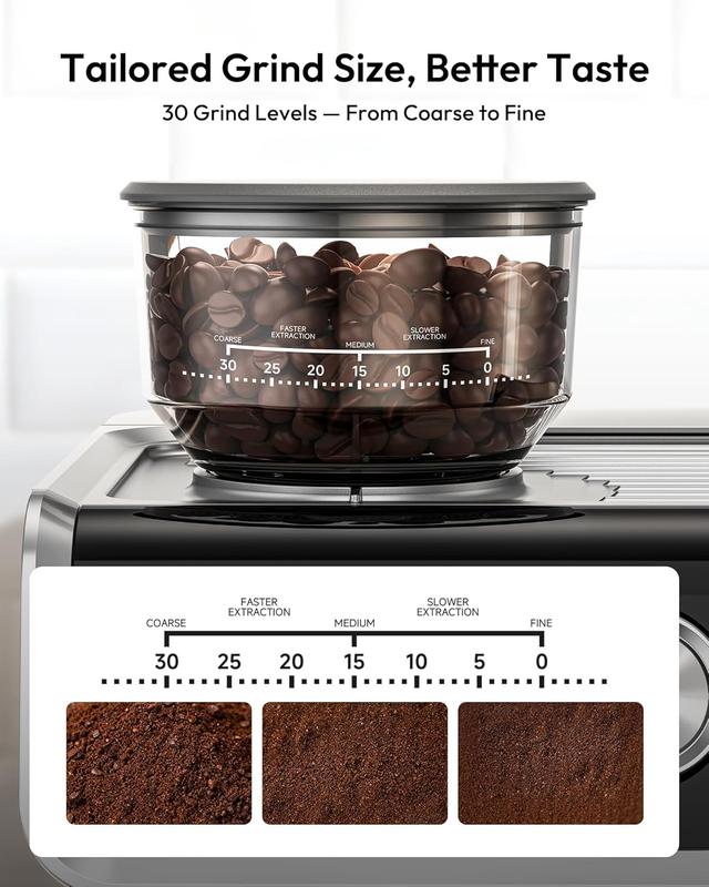 【The All-in-One Choice for the Home Barista】 This Espresso Machine with Grinder features 30 adjustable grind settings for precise dosing—from fine espresso to coarse drip. The durable, built-in Integrated Grinder streamlines your setup, while the anti-clogging chute ensures smooth, mess-free operation for a perfect start to your coffee workflow.
