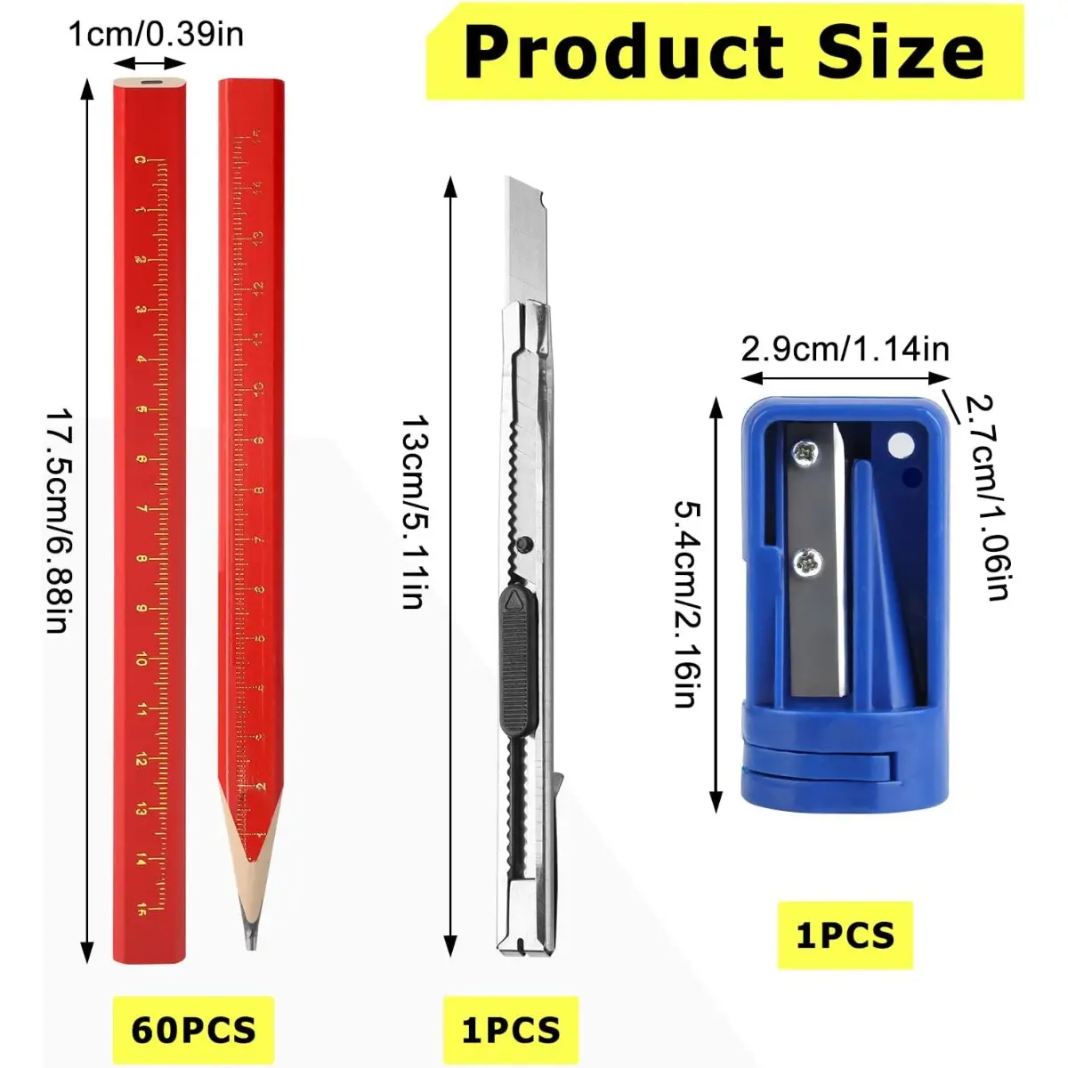 ✨ Pack of 60pcs Carpenter's Pencils, perfect for construction sites. These red octagonal pencils feature a 175 mm thick core, ideal for carpentry drawings. Each pack includes a pencil sharpener and an art knife. 🛠️