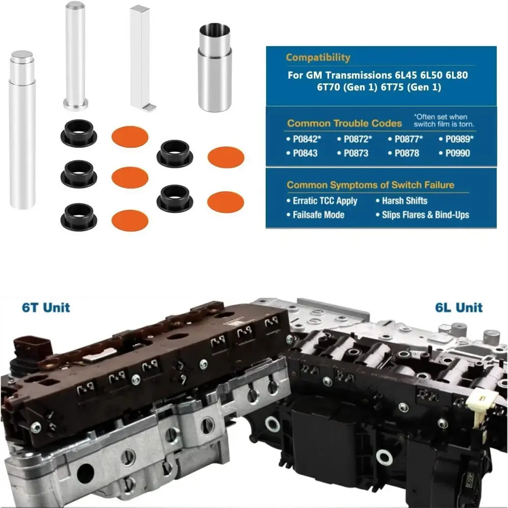 Our Pressure Switch Rebuild kit works with F 124740-30K, is compatible with GM Transmissions 6L45 6L50 6L80 6T70 (Gen 1) 6T75 (Gen 1).