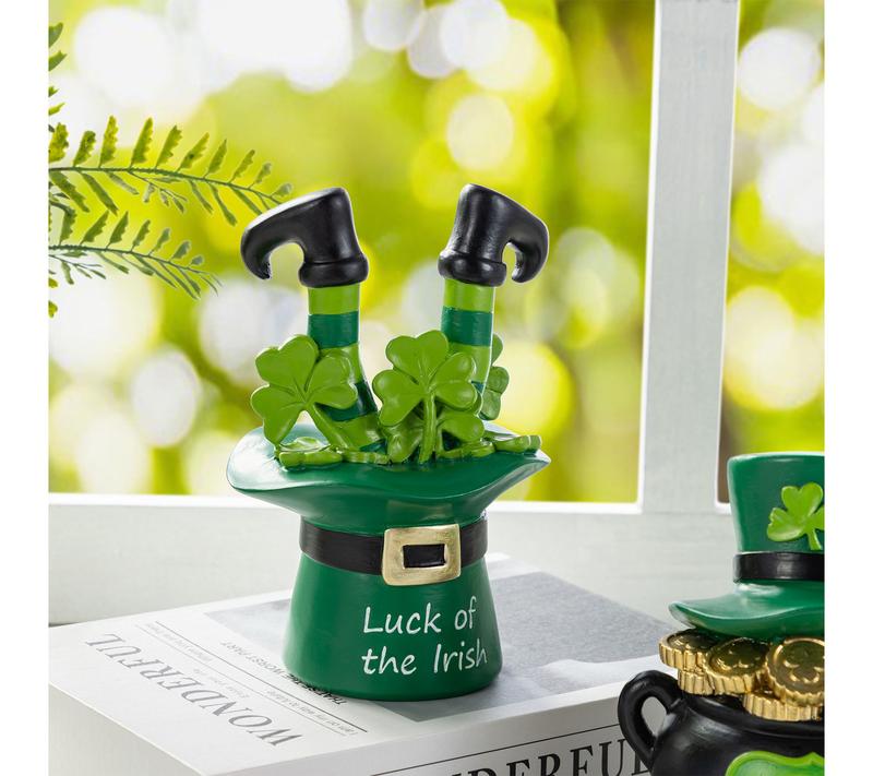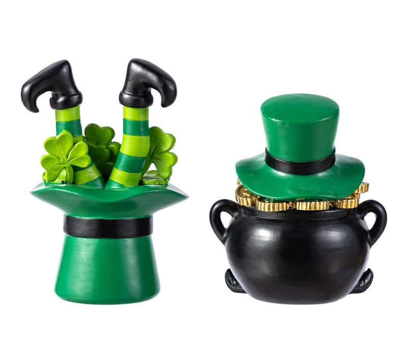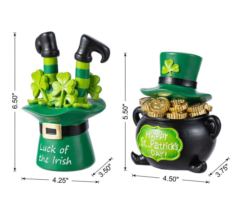 Bring a bit of Irish luck to your home with this set of whimsical St. Patrick's Day table decorations -- one featuring a black pot adorned with a green top hat and sparkling gold coins, the other a playful hat with striped legs and cheerful shamrocks. Whether brightening up a mantel, centerpiece, or narrow shelf, these resin accents create a festive scene that promises smiles all March long. From Glitzhome.
