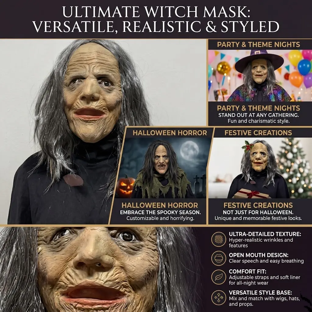 🧙 Witch & Grandma Style – Unique design combining spooky witch vibes with a scary grandma disguise.