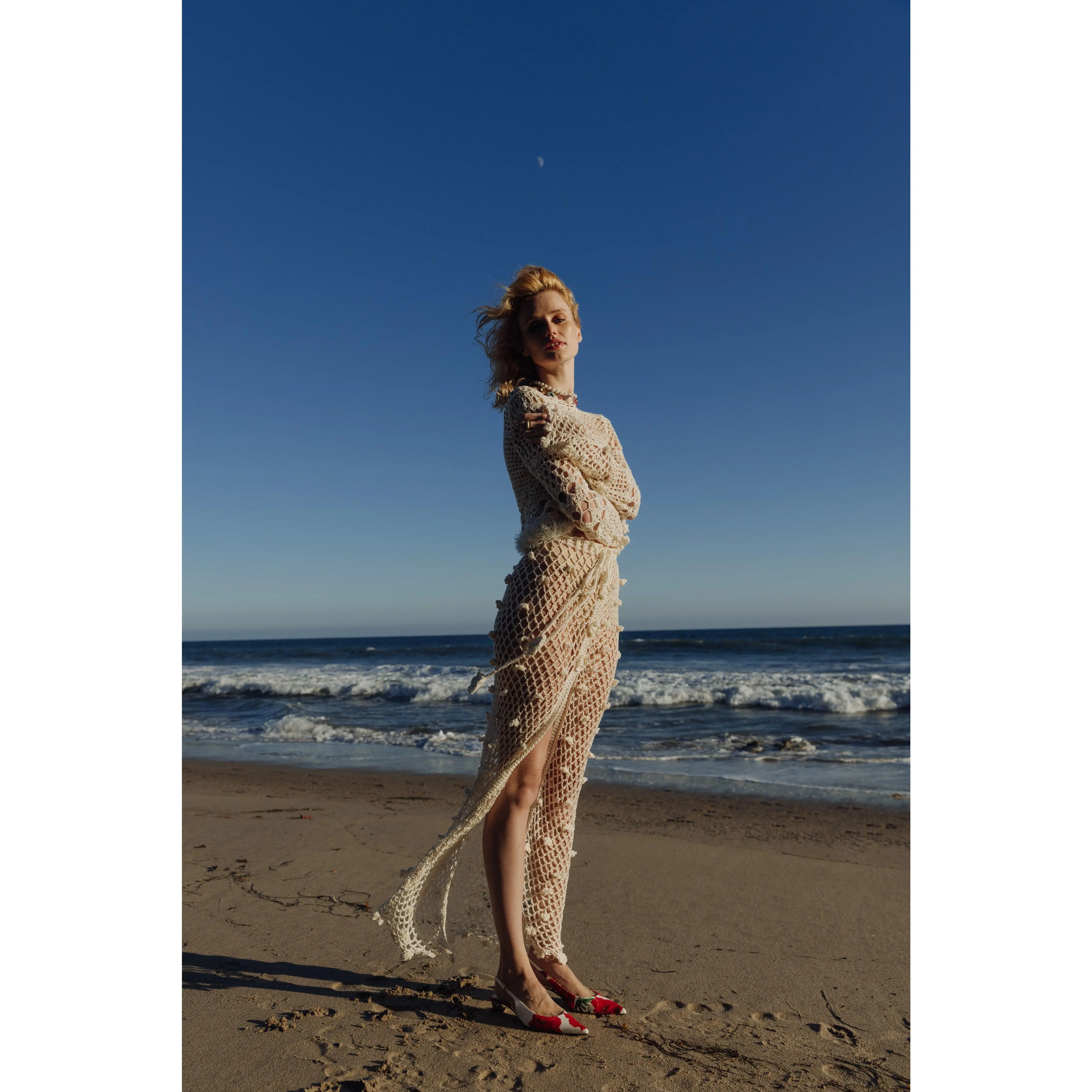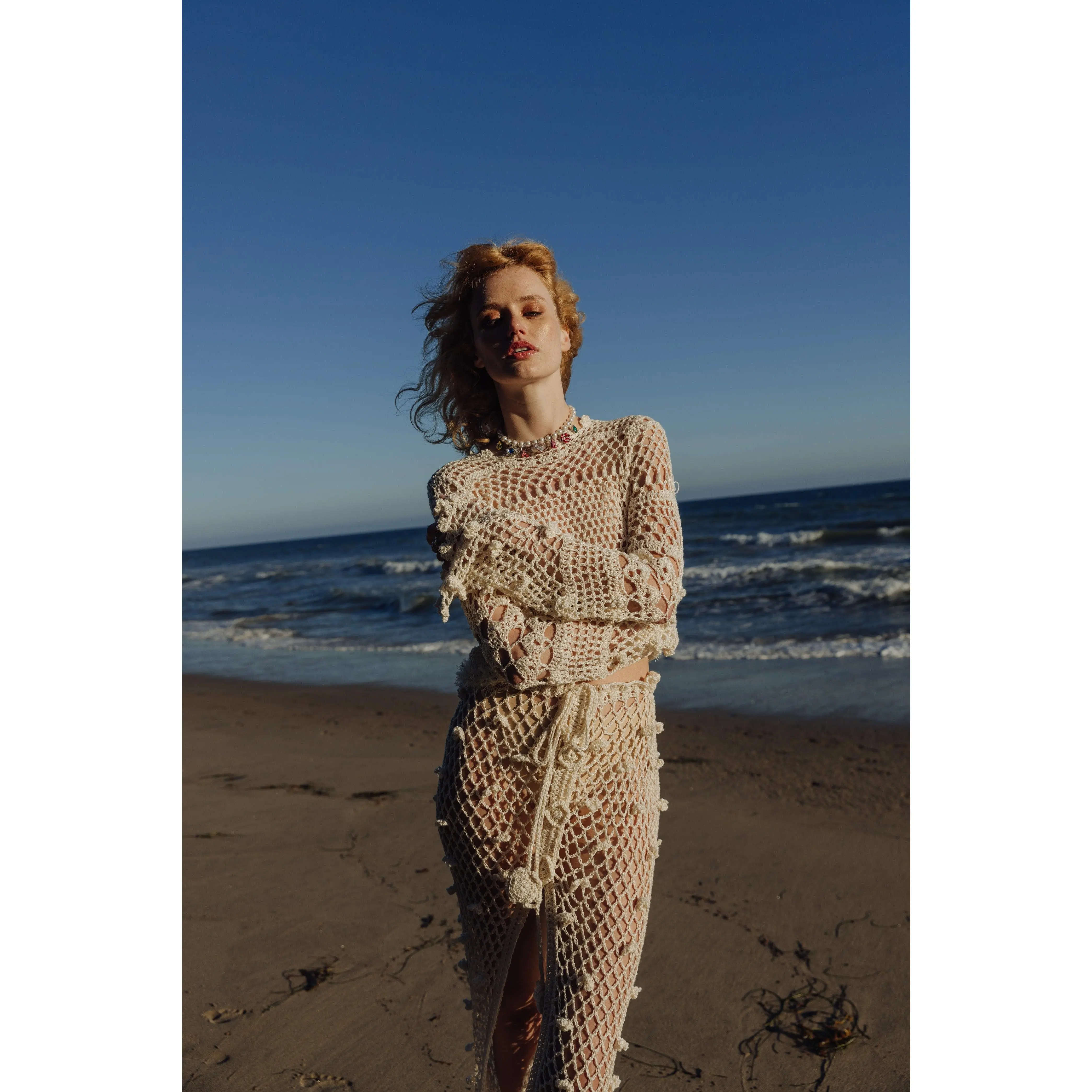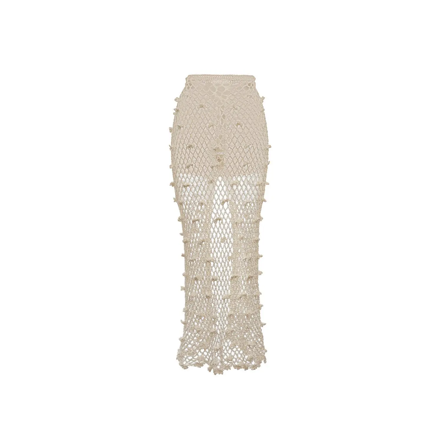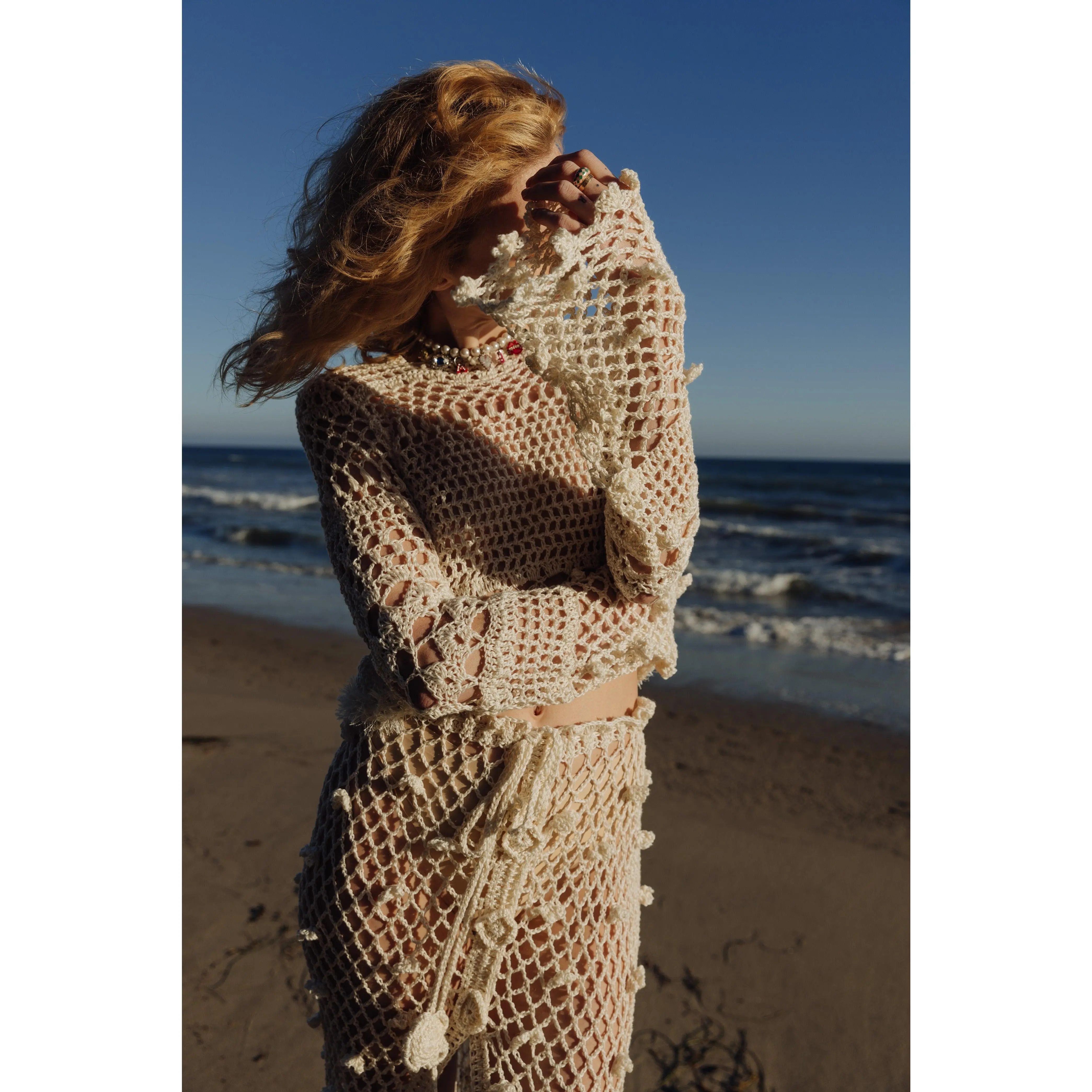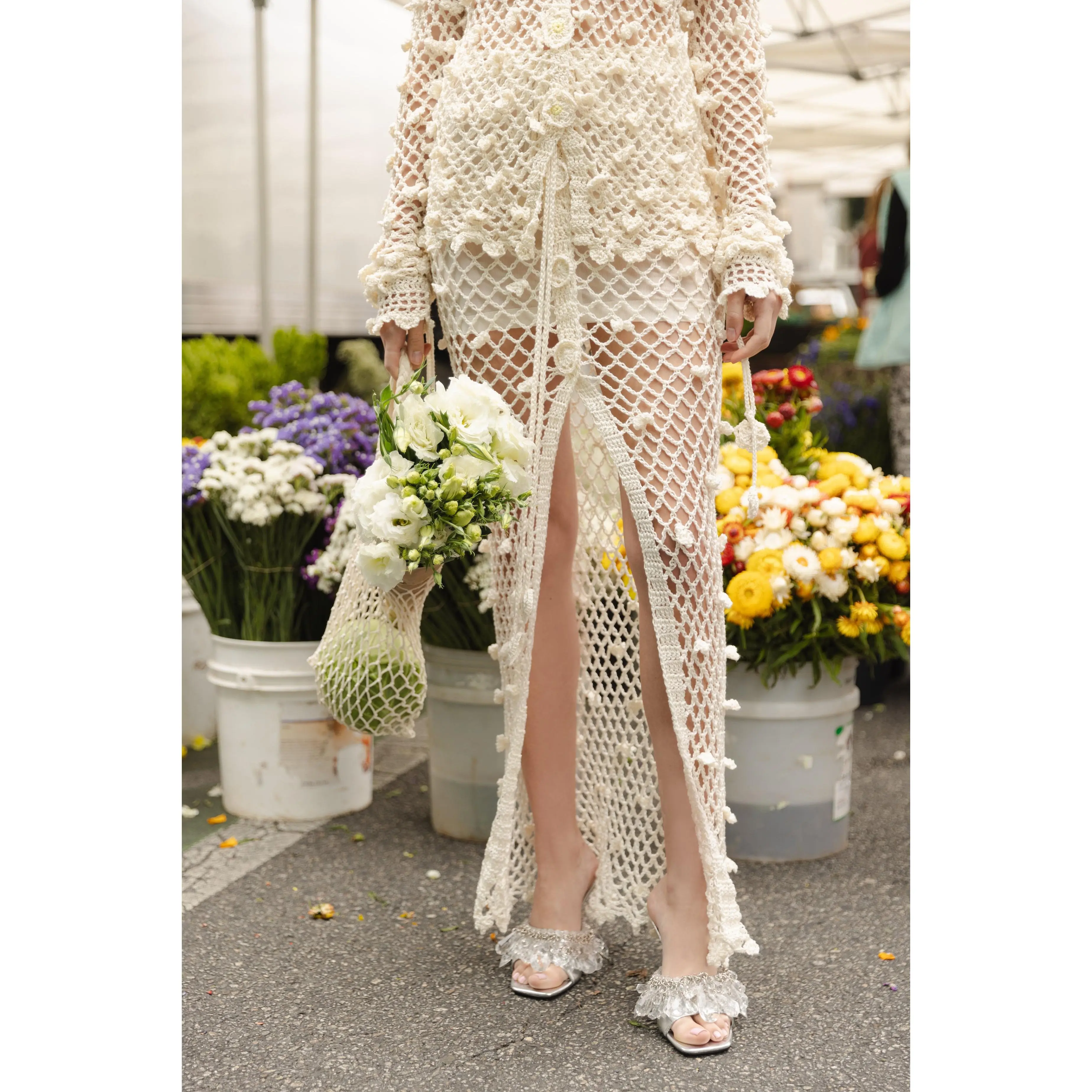 White handmade crochet skirt has a loose open-knit detail throughout, a fitted silhouette creates perfect fit. Perfect combination white white crochet top and pair of mules.