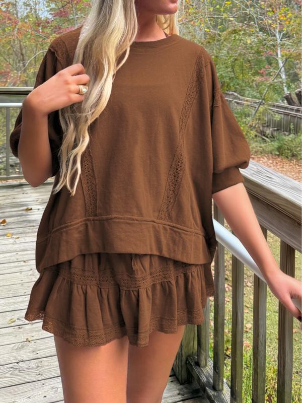 ·Delicate lace trim on the top’s seams and shorts’ hem adds a touch of elegance. 🌸