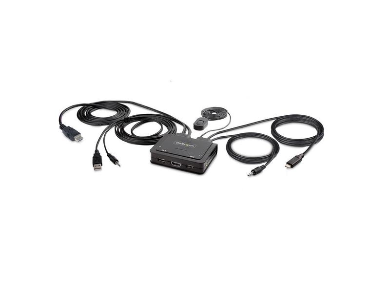 Share a mouse, keyboard, and a 4K 60Hz HDMI display between a USB-A computer and a USB-C HDMI Alt-mode computer, using this KVM Switch with built-in cablesThis Hybrid KVM Switch enables users to switch between a USB Type-A and HDMI-enabled desktop and a USB Type-C (DP Alt-Mode) enabled laptop, to share a keyboard, mouse, audio input/output devices, and a single 4K 60Hz HDMI monitor. Hassle-Free SetupThe KVM switch is bus powered and features built-in HDMI, USB-A, USB-C, and 3.5 mm Audio Input/Output cables. This ensures compatibility and performance between the KVM switch, monitors, and peripherals - without the need to select and purchase the cables required for those connections.