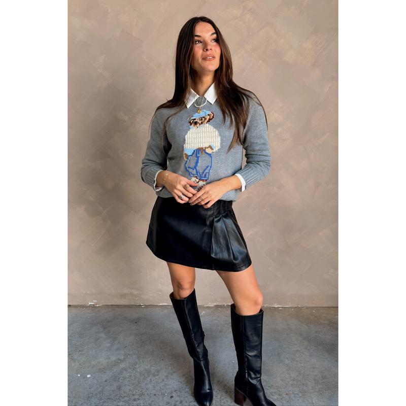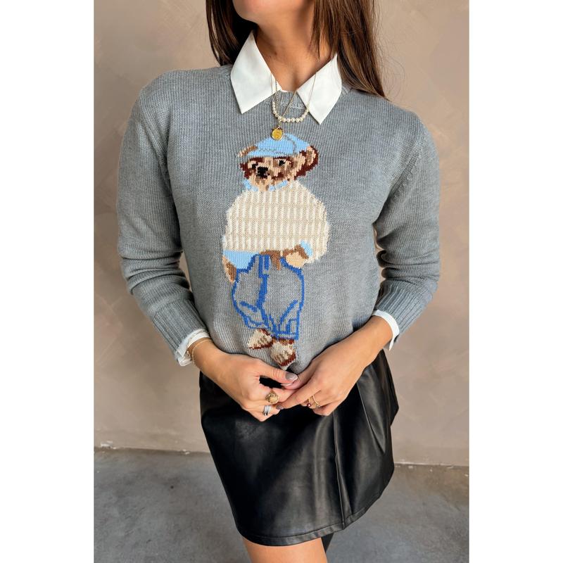 The Tegan Grey Teddy Bear Sweater is a cozy and playful addition to your casual wardrobe. Made from soft grey knit fabric, it features a charming teddy bear stitch graphic that adds a fun, whimsical touch. The round neckline and long sleeves provide a classic, comfortable fit that’s perfect for layering or wearing on its own.